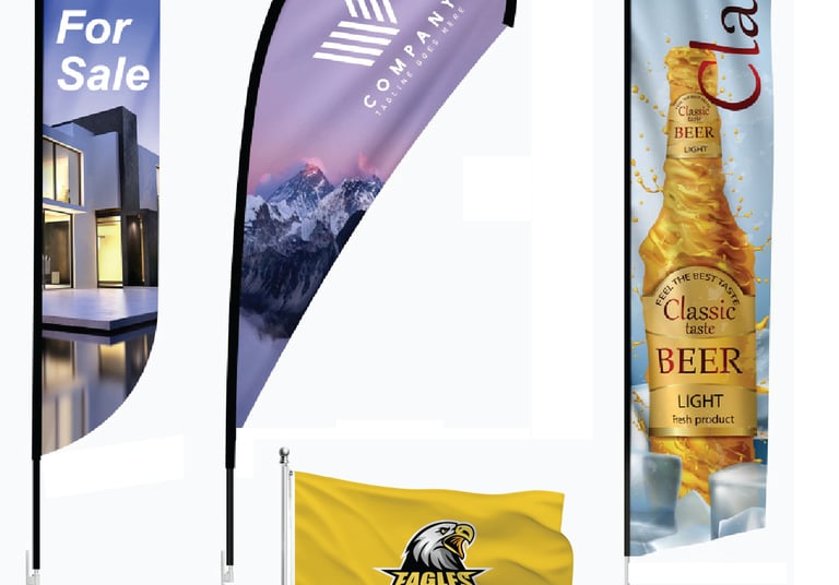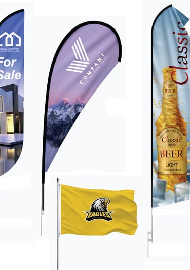 Attention—getters for retailers, events, and trade shows. Flags can be folded, stored, and assembled with ease—indoor and outdoor hardware available.