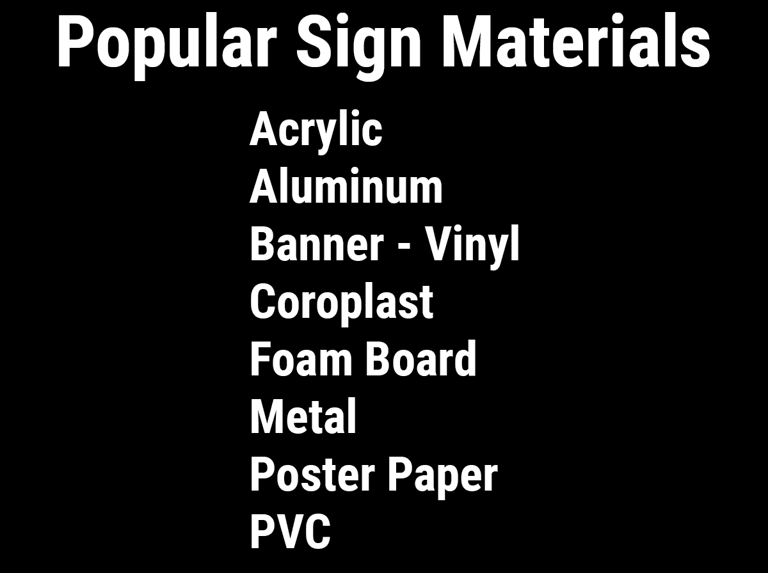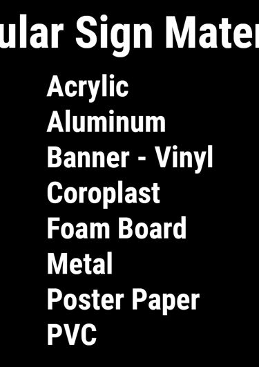 Our signs are made from high-quality materials such as aluminum, ACM, acrylic, PVC, coroplast, wood, and premium vinyl. We carefully choose the right substrate for each project to deliver long-lasting, professional results indoors or outdoors.
